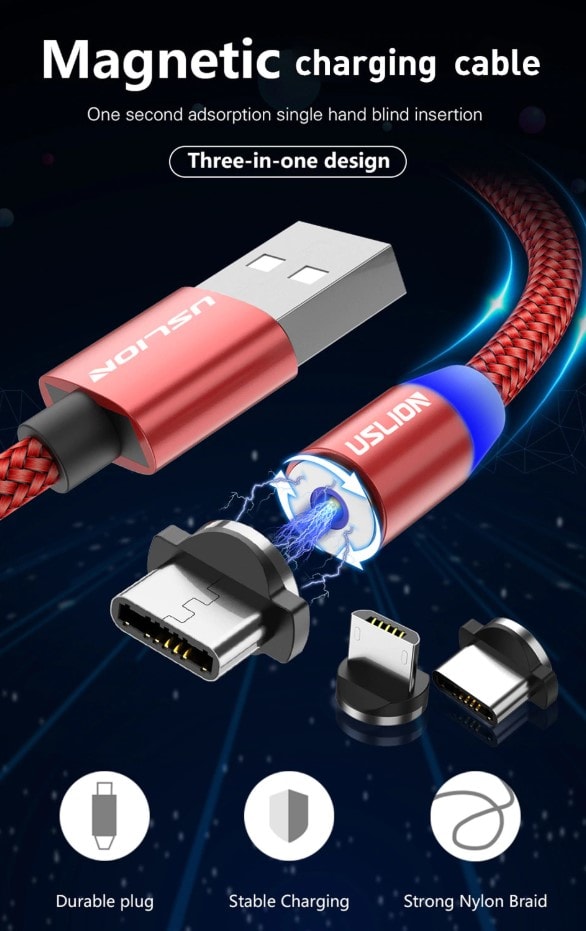 1 magnetic phone charger cable compatible with 3 magnet adapters for i-Product, Android Micro USB & Type-C.